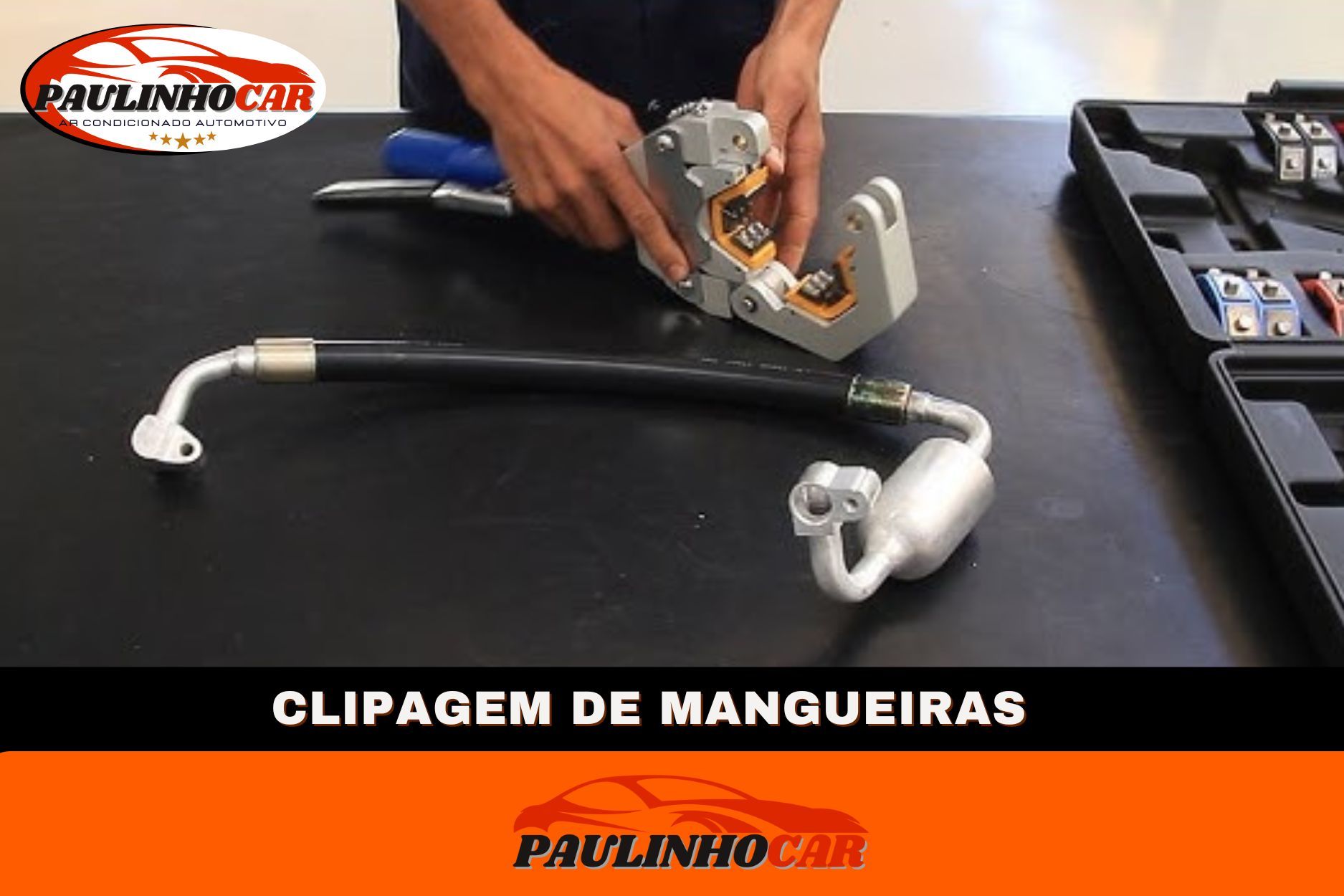 A clipagem de mangueiras também pode ser feita com uma clipadeira hidráulica portátil, que é uma ferramenta essencial para realizar conexões precisas em mangueiras de ar condicionado automotivo.